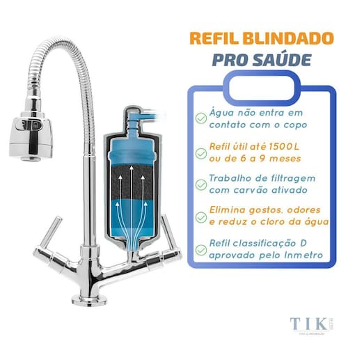 O sistema de filtragem dessa torneira é processado por um refil blindado, que conta com carvão ativado para garantir uma água ainda mais pura. Esse refil deve ser trocado a cada 6 meses, seguindo a recomendação do Inmetro, para manter a eficiência da filtragem.