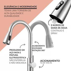 Com uma ducha pré-lavagem flexível, possui suporte em mola para sustentação e segurança. A torneira gourmet tem saída de água tradicional com mecanismo 1/4 de volta e bica giratória, com arejador em aço inox com tela para um fluxo de água arejado.