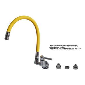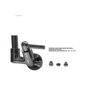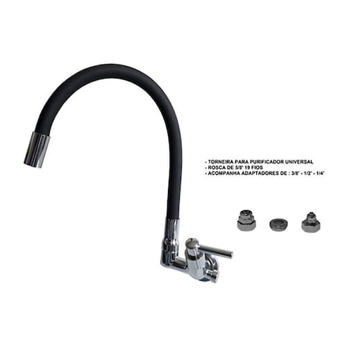 Torneira Gourmet Parede Com Saída Universal Para Purificador Cor: Preta torneira com saida universal para purificadores. Sua rosca de 5/8' 19 fios acompanha adaptadores de 3/8' - 1/2' - 1/4'. servindo em purificadores de diversos modelos e marcas. O design desta torneira de mesa deixa a cozinha muito sofisticada e elegante, tornando-se um objeto de decoração indispensável. Perfeita para varandas gourmet. É uma peça multiuso e prática, com atributos que agregam nas tarefas do dia a dia. Possui rapidez no acionamento e fechamento, proporcionando economia de água. Sua cozinha merece essa qualidade. - Torneira fabricada em metal latão cromado de alta resistência e durabilidade, proporcionado um custo beneficio sem igual. - Tubo de silicone colorido totalmente flexível 50 cm . - Sistema de Acionamento de volta com pastilhas cerâmicas. - Fácil instalação e manutenção. - Recomendações de Uso, Manutenção e Limpeza: Limpar a torneira apenas com um pano macio e sabão neutro. Não usar produtos abrasivos como: sapólio, palha de aço e produtos químicos. Marca: Lhd Metais