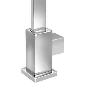 Torneira com acionamento 1/4 de volta, com design no estilo retangular, detalhes quadrados e saída da bica lateralmente.