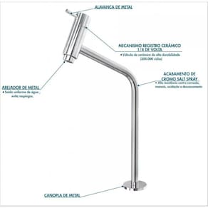 Sobre o produto: Torneira p/lavatório link / soft 45° 1/4 volta bica alta 37cm metal cromado Descrição do produto: Torneira de mesa estilo link / soft 45° 1/4 de volta, com cano e corpo fabricada em metal cromado de alta resistência e durabilidade, com arejador de metal que permite economia de água. Possui mecanismo cerâmico para 200.000 ciclos. Itens inclusos:1 torneira p/lavatório link / soft 45° 1/4 volta bica alta 37cm metal cromado Informações logísticasVol.01 comp: 450mm prof: 450mm alt: 115mm peso: 0,8kg Observações:Não acompanha acessórios decorativos. Imagens meramente ilustrativas. Informações técnicas / características: Torneira p/lavatório link / soft 45° 1/4 volta bica alta 37cm metal cromado Descrição: torneira p/lavatório link / soft 45° 1/4 volta bica alta 37cm metal cromado Marca: fabricação nacional Instalação: de mesa Tipo: convencional Referência: 1062 Utilização: lavatório Furação da bancada / cuba: 7/8 32mm Bitola saída cano: 1/2 20mm Material: liga metálica - latão cromado de alta resistência aço inox + cobre + zinco Acabamento: camada de cromo salt spray 144h possui alta resistência contra corrosão, maresia, oxidação e descascamento. Mecanismo: cartucho cerâmico de alta durabilidade 200.000 ciclos , 1/4 volta Arejador: corpo de arejador de metal, que além de ser mais resistente e garantir economia de água, proporciona conforto para as mãos e evita respingos. Temperatura da água: 5° celcius a 70° celcius Pressão da água: funcionamento perfeito em baixa e alta pressão, de 0,2 a 4 kgf/cm² ou 3 a 57 psi. Peso: 0,45 kg Garantia: 05 anos de garantia contra defeitos de fabricação pelo fabricante . Pecas com desgaste natural por uso como o reparo a garantia é de 1 ano. Medidas do produto Altura da base até a saída da água: 27cm Profundidade da saída da água até o final do cano: 14cm Altura total: 37cm