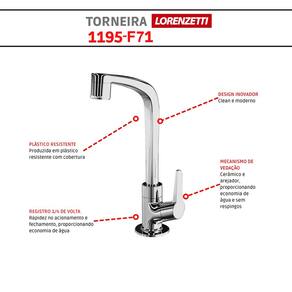 CARACTERÍSTICAS TÉCNICAS: - Marca: Lorenzetti; - Linha: Flatt; - Modelo: 1195 F71; - Tipo: Torneira para lavatório de mesa; - Cor: Cromado; - Material: ABS com acabamento cromado; - Acionamento: 1/4 de volta com vedação cerâmica; - Bica: Alta com arejador embutido; - Rosca de entrada: 1/2" (DN15); - Pressão de funcionamento: 1,5 a 40 m.c.a; - Temperatura máxima da água: 50°C;