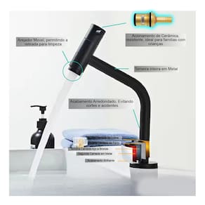 A altura elevada da torneira oferece praticidade no uso diário, proporcionando mais espaço para lavar o rosto, as mãos e realizar outras tarefas com conforto. Esse design facilita a limpeza e o enchimento de recipientes maiores, tornando seu banheiro mais funcional e eficiente.