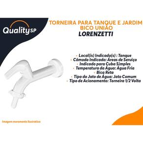 Características Principais: • Marca: Lorenzetti • Local indicado: Tanque e áreas de serviço • Cômodo indicado: Áreas de serviço • Indicado para: Cuba simples • Temperatura da água: Água fria • Bica: Reta, proporcionando um jato comum de água • Tipo de acionamento: Torneira com 1/2 volta, garantindo facilidade no controle de vazão
