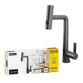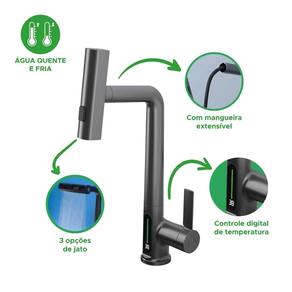 Torneira monocomando para cozinha com bica móvel e giratória de 1080, garantindo mais flexibilidade e praticidade no dia a dia. Conta com três opções de jato, adaptando-se a diferentes necessidades, desde um fluxo suave até um mais intenso. O sistema monocomando permite um controle preciso da temperatura e do fluxo de água, proporcionando conforto e economia. Para os dias frios, ela também é sua aliada. Se sua cozinha contar com um sistema de aquecimento elétrico ou a gás, você poderá usufruir de água quente consulte um profissional para verificar a possibilidade de uso . Além disso, possui um display que informa a temperatura da água, garantindo mais segurança e praticidade no uso diário. Especificações Técnicas: - Altura: 40 cm torneira Alta - Local de Instalação: pia/ bancada - Encaixe para filtro: Não - Aplicação: Cozinha - Material Predominante: Metal - Acabamento: Cinza e Preto - Bica Giratória: 1080 graus - Spray: Jato e Ducha - Extensível: Sim - Controle de Temperatura Digital esse recurso só estará disponível caso seja instalada junto ao sistema de aquecimento da casa Itens Inclusos: - Torneira - Base metal de instalação da torneira - Junta de borracha -kit fixador - Chave Hexagonal - Contrapeso para retorno da mangueira - Fixador - Manual de Instalação - : 5 anos Marca: Não Informado
