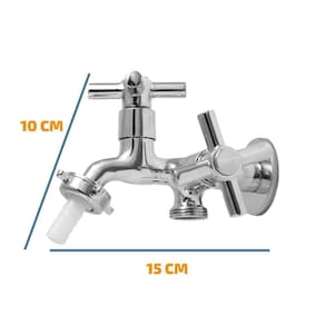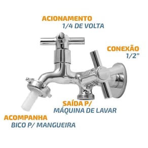 Acionamento com apenas 1/4 de volta, maior controle sobre o consumo da água; Bico para mangueira incluso, é só encaixar e utilizar; Saída para conectar a máquina de lavar, com apenas uma torneira você faz dois tipos de uso; Conexão de 1/2, padrão na maioria dos locais; Super leve e resistente, não enferruja e não mancha; Tamanho minimalista, não atrapalha o uso no tanque;