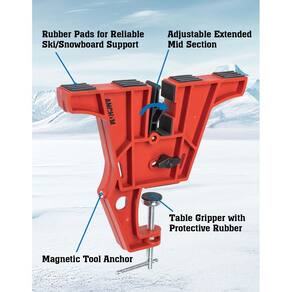 ANCHOM Torno de esqui e snowboard para afinação, depilação e reparo, 2 conjuntos de alças antiderrapantes - Conjunto de 2 peças: O grampo de esqui e snowboard ANCHOM inclui um par de tornos de snowboard profissionais junto com 2 retentores de freio. Eles são compatíveis com todos os esquis e pranchas de snowboard, independentemente da largura, e são muito úteis para ajustar rapidamente várias posições, bordas e encerar. - Durável e estável: construção de plástico de engenharia de alta resistência e material de construção de borracha para manter durável e estável. - Ângulos ajustáveis: os tornos de esqui e snowboard apresentam ângulos ajustáveis, atendendo às necessidades de enceramento, reparo e afiação de todas as posições e ângulos - Antiderrapante e seguro: várias superfícies de borracha garantem que seus esquis e pranchas permaneçam seguros e protegidos contra arranhões e abrasões. - Ampla aplicabilidade: o mecanismo de ajuste inferior dos tornos de snowboard permite que eles se fixem em várias mesas. A espessura máxima acomodada pode chegar a 5,5 cm