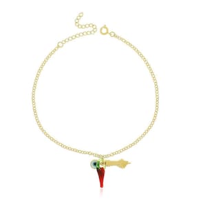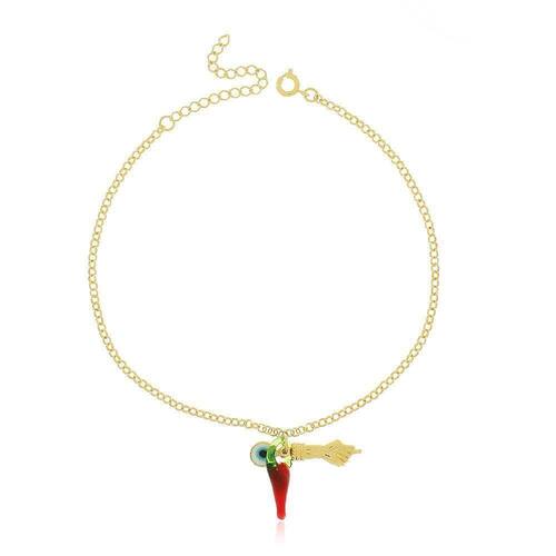 Tornozeleira Pingente De Pimenta Olho Grego E Figa Banhado