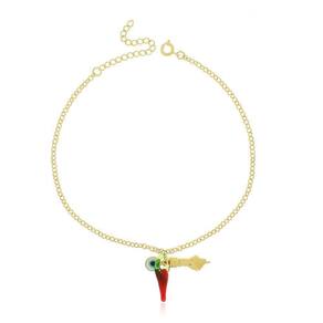 Tornozeleira Pingente de Pimenta Olho grego e Figa Banho de Ouro Tamanho da Tornozeleira: 24cm Figa 2cm x 07mm Olho Grego 0,6mm x 0,6mm Pimentinha 2cm x 0,5mm Peso Total : 3.9g - Acompanha embalagem para presentear conforme imagem - Acompanha certificado de -temos uma equipe preparada para te auxiliar no pós venda Jhulias Joias e Semi Joias Joias de Qualidade Marca: Não Informado Ean: 7793833683863