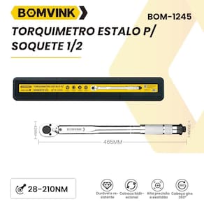 Produto: Torquímetro de estalo encaixe 1/2" capacidade 28 - 210 Nm - BOM-1245 Marca: Bomvink Descrição: O Torquímetro de estalo encaixe 1/2" capacidade 28 - 210 Nm BOM-1245 da Bomvink é a ferramenta ideal para profissionais que buscam precisão e durabilidade em seus trabalhos. Com capacidade de até 210Nm, ele garante apertos perfeitos em parafusos e porcas, evitando danos e garantindo a integridade das suas peças. Características: • Encaixe de 1/2": Adapta-se a diversos soquetes e acessórios. • Capacidade de 28 a 210Nm: Ideal para uma ampla gama de aplicações. • Catraca bidirecional: Permite ajuste de torque tanto para aperto quanto para afrouxamento. • Alta precisão: Garante resultados confiáveis em cada utilização. • 360° de rotação da cabeça: Facilita o acesso a locais de difícil alcance. • Construção robusta: Durabilidade e resistência para trabalhos intensivos. Benefícios:- Aumento da produtividade: Trabalhos mais rápidos e eficientes.- Prevenção de danos: Evita o aperto excessivo de parafusos.- Maior segurança: Garante a integridade das suas peças e equipamentos.- Versatilidade: Ideal para diversas aplicações em oficinas, indústrias e construção civil. Ideal para: - Mecânicos: Aperto de parafusos em motores, chassis e outras peças.- Industriais: Montagem de equipamentos e máquinas.- Construção civil: Montagem de estruturas metálicas.- Profissionais em geral: Para qualquer trabalho que exija precisão no aperto de parafusos.Especificações: Capacidade: 28 - 210NmEncaixe: 1/2"Direção: Bidirecional. Marca: Não Informado