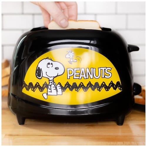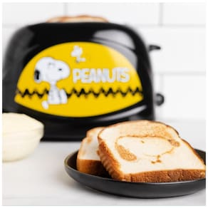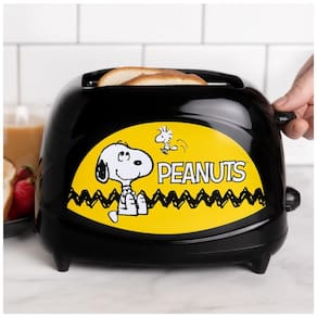 Torradeira 2 fatias Uncanny Brands com tema Snoopy, termostato ajustável, funções de reaquecimento, descongelamento e parada rápida. Estrutura em plástico polipropileno e placas internas de alumínio estampado.Permite ejeção manual