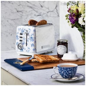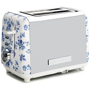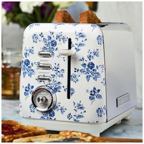 Torradeira 2 fatias em aço inox com acabamento em rosa China e estampa floral exclusiva. Possui 7 níveis de ajuste, slots auto-centralizantes extra largos, funções para descongelar, reaquecer e modo bagel. Inclui alavanca de elevação alta, rack superior para aquecer croissants e bandeja removível para migalhas.Permite ejeção manual