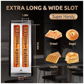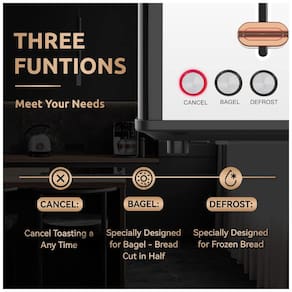 Torradeira de 4 fatias em aço inoxidável com 6 níveis de tostagem, bandeja de migalhas removível, função cancelar, descongelar e bagel, e guias autocentrantes.Permite ejeção manual