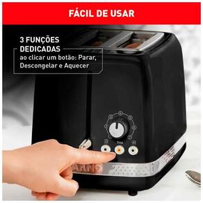 Funções: Parar (interromper imediatamente o ciclo de torragem); Descongelar (torrar pão congelado); e Reaquecer