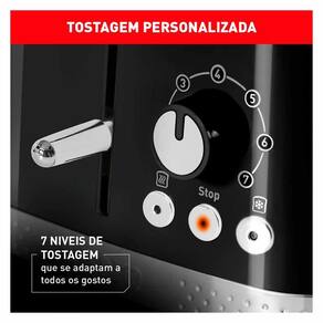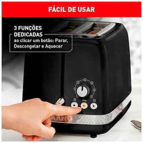 Funções: Parar (interromper imediatamente o ciclo de torragem); Descongelar (torrar pão congelado); e Reaquecer