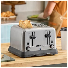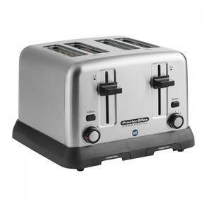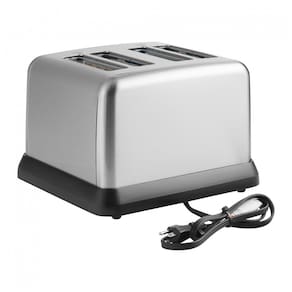 Torradeira comercial com 4 fatias, entradas extra largas, função Toast Boost para facilitar a retirada de fatias pequenas, construção em aço inoxidável e 2 bandejas removíveis para migalhas.Permite ejeção manual