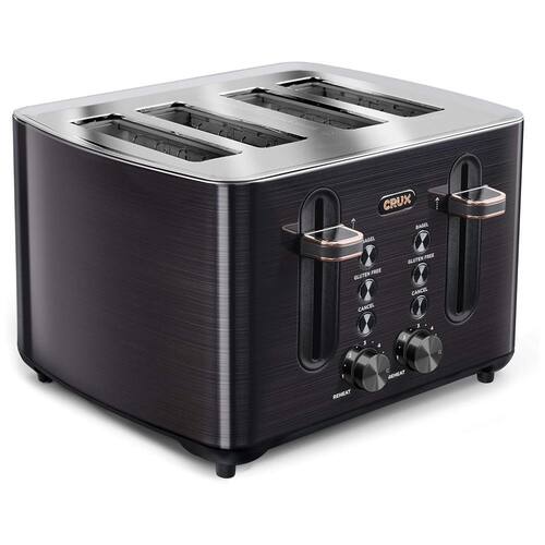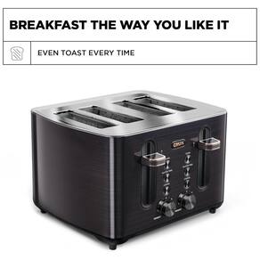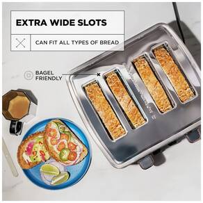 Torradeira de 4 fatias em aço inoxidável com 6 níveis de tostagem, função sem glúten, anti bloqueio, desligamento automático e ranhuras extra largas para diversos tipos de pão.Permite ejeção manual