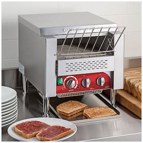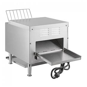 Torradeira de esteira comercial com 10 polegadas de largura, capacidade para 800 fatias por hora. Possui controle de velocidade da esteira e 8 configurações independentes de calor. Design robusto em aço inoxidável com controles separados para elementos superior e inferior.Permite ejeção manual