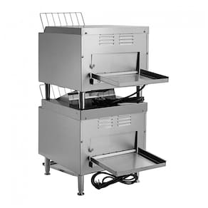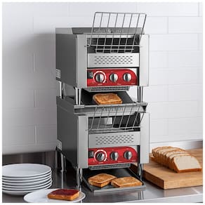O design empilhado de alta eficiência desta torradeira tosta até 800 fatias de pão por torradeira, por hora, em uma esteira com 3 aberturas para uma variedade de pães, bagels e muffins. O guia de produtos na frente ajuda a carregar os alimentos. Velocidade do transportador totalmente ajustável e controle de calor independente com 8 configurações para obter a torrada perfeita. Construção robusta em aço inoxidável com pernas e botões de controle em aço inoxidável. 208V, 3300W por torradeira. Este conjunto de torradeiras de esteira apresenta um par de torradeiras de esteira T3300B empilhadas verticalmente para minimizar o espaço no balcão e maximizar a produção. Como pode tostar até 1600 fatias de pão ou metades de bagel por hora, você pode ter certeza de que está pronto para atender à demanda. Cada esteira de transportador de 10 polegadas de largura cabe 2 fatias lado a lado, enquanto seu tamanho de abertura de 3 polegadas acomoda uma variedade de produtos. O design único do elemento ajuda a produzir uma torrada perfeita sem ressecar o produto. Toste facilmente pão, bagels, muffins em inglês ou pãezinhos conforme o pedido do cliente. Um guia frontal até mesmo ajuda a carregar o produto com segurança, garantindo que cada fatia seja puxada diretamente para a unidade para torradas eficientes e consistentes. E com 2 torradeiras, você aumenta ainda mais sua flexibilidade, usando ambas as unidades para produzir volumes altos do mesmo produto, ou usando cada uma para fazer um produto assado diferente! Cada torradeira possui 8 opções de velocidade do transportador, que são fáceis de ajustar com botões de controle robustos. Esse controle permite que o operador selecione por quanto tempo o pão será torrado, determinando a coloração e crocância final. Além disso, os controles independentes são integrados para os elementos superior e inferior. Cada controle inclui configurações de 1 a 6 e fornece ao operador controle adicional para resultados de torrada personalizados e fáceis. Os controles individuais superior e inferior permitem que uma variedade de produtos seja torrada, como pães, bagels e muffins. Feito de aço inoxidável, este conjunto de torradeiras apresenta calhas dianteiras e traseiras fáceis de conectar e desconectar conforme necessário. Ele fica em pernas ajustáveis ??de aço inoxidável, garantindo que o balcão fique acessível para fins de limpeza. Cada torradeira horizontal de esteira requer uma conexão elétrica de 208V para operação. Para versatilidade, esta torradeira pode dispensar o produto pela frente ou por trás nas calhas incluídas. Além disso, possui 3 slots para acomodar grandes quantidades de seus alimentos mais populares, desde pão fatiado tradicional até bagels e pão de forma. Dispensar o produto pela parte de trás permite versatilidade de passagem da cozinha para a área de atendimento, enquanto dispensar o produto na frente reduz a pegada no balcão da unidade, e até permite que os usuários tostem o produto por conta própria para reduzir custos trabalhistas.