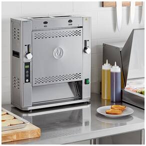 Torradeira de pão de forma vertical com esteira de arame, display digital, eletrônicos para precisão, construção em aço inoxidável, design compacto, esteira removível para limpeza fácil. Tosta até 2200 pães por hora.Permite ejeção manual