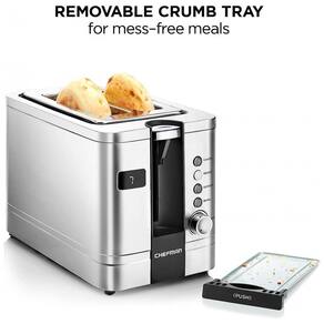 CONTAGEM REGRESSIVA PARA A SUA COZINHA Com um display digital claro e temporizador de contagem regressiva ajustável, não há necessidade de se preocupar em cozinhar demais sua comida. Basta selecionar sua configuração, assistir o cronômetro e esperar por bagels, pão e muito mais SELECIONE SEU TOM Com 4 modos de cozimento com um toque, você pode torrar do seu jeito. Selecione entre 7 tons com controle de discagem intuitivo para escurecimento personalizado de seus favoritos de comida. COZINHE CONVENIENTEMENTE Esta torradeira digital tem dois slots extra largos para que você possa torrar seus pães e bagels de café da manhã com uma brisa. Com o elevador auxiliar e uma função anti encravamento, pode retirar com segurança e facilidade a sua refeição matinal. LIMPE COM FACILIDADE A bandeja de migalhas removível facilita a limpeza rápida após a torra. O acabamento em aço inoxidável limpa facilmente e será exibido lindamente em sua bancada RECURSOS Aprovação cETL com tecnologia de segurança avançada para longa durabilidade. 850 Watts, 120 Volts RJ31 SS V2 D