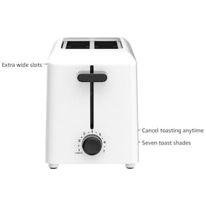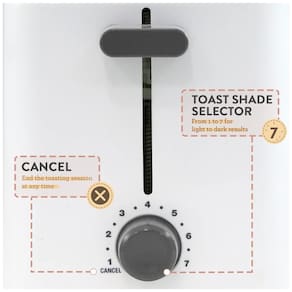 Torradeira elétrica para 2 fatias com 7 níveis de tostagem, ranhuras extra largas para diversos tipos de pães, guias autocentrantes para um tostado uniforme e bandeja de migalhas suspensa.Permite ejeção manual