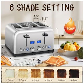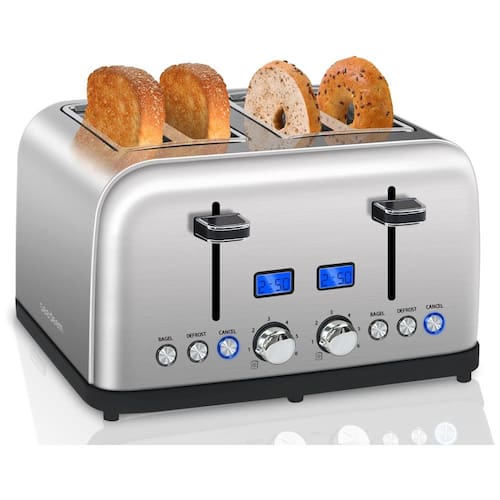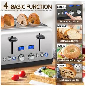 Torradeira elétrica SEEDEEM com 6 níveis de tostagem, visor LCD com contagem regressiva, funções de cancelar, bagel, descongelar e reaquecer. Possui slots largos para diversos tipos de pão e controle independente dos slots.Permite ejeção manual