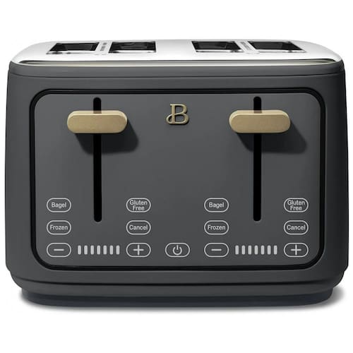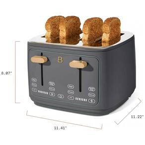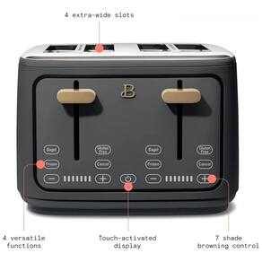 Torradeira elétrica de 4 fatias com ranhuras extra largas autoajustáveis, 7 níveis de tostagem, funções para descongelar, reaquecer e ajuste de tostagem. Painel digital touch com display e timer. Corpo em aço com acabamento fosco. Alavanca de elevação alta. Bandeja de migalhas removível. Organizador de cabo.Permite ejeção manual