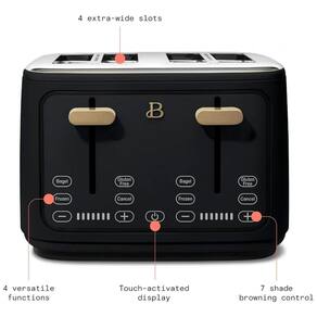 Torradeira elétrica de 4 fatias com ranhuras extra largas autoajustáveis. Possui 7 níveis de tostagem, funções para descongelar, reaquecer e ajuste de tostagem. Display digital touch com controle de tempo por LEDs. Corpo em aço com acabamento fosco. Alavanca de elevação alta. Bandeja de migalhas removível e organizador de cabo.Permite ejeção manual