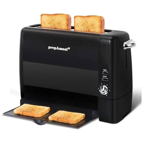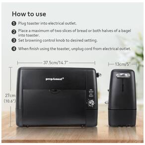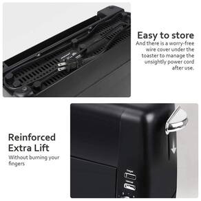 Torradeira elétrica para 2 fatias com 6 níveis de tostagem, bandeja de migalhas removível, compartimentos extra amplos para diversos tipos de pão, construção em material PP reciclável e aço inoxidável 430.Permite ejeção manual