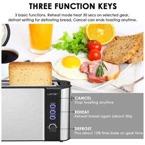 Torradeira elétrica 2 fatias, 1000W, com 6 níveis de tostagem, função bagel, rack de aquecimento embutido, função de pop up automático, modos descongelar, reaquecer e cancelar. Bandeja removível para migalhas e enrolador de cabo.Permite ejeção manual