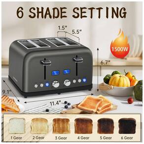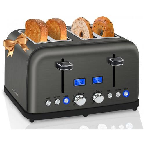 Torradeira elétrica 110V com 6 níveis de tostagem, capacidade para 4 fatias, funções descongelar, reaquecer e bagel, visores LCD com contagem regressiva e controle duplo independente para cada slot.Permite ejeção manual