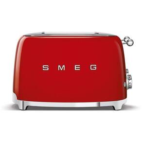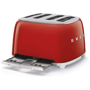 Torradeira elétrica Smeg 50s Retro Line com corpo em aço inoxidável revestido a pó, 4 compartimentos individuais, 2 painéis de controle independentes, função pop up automático e bandeja removível para migalhas.Permite ejeção manual