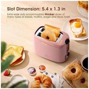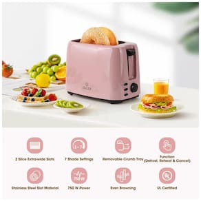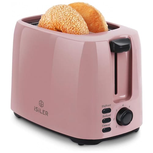 Torradeira elétrica retrô iSiLER com 2 fatias, 7 níveis de tostagem, funções descongelar e reaquecer, bandeja de migalhas removível e slots extra largos. Possui alta potência de 750W e corpo em PP com certificação UL.Permite ejeção manual
