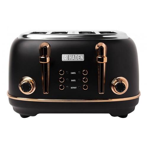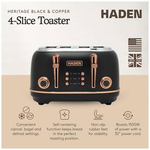 Torradeira HADEN Heritage 4 fatias em aço inoxidável com acabamento polido e detalhes metálicos. Possui 4 fendas largas com função de autocentralização, 6 níveis de tostagem, e funções de descongelar, bagel e cancelar. Base com pés antiderrapantes e bandejas removíveis para migalhas.Permite ejeção manual