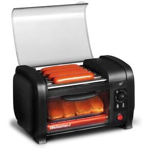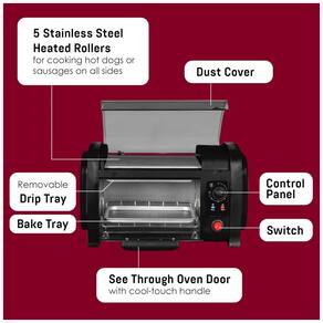Cinco rolos aquecidos de aço inoxidável giram automaticamente, cozinhando cachorros quentes ou salsichas em todos os lados simultaneamente.Permite ejeção manual