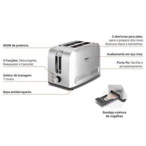 7 níveis de tostagem, 3 funções (Descongelar, Reaquecer, Cancelar), capacidade para 2 torradas, acabamento em inox, pés antiderrapantes, bandeja coletora de migalhas, porta-fio.Permite ejeção manual
