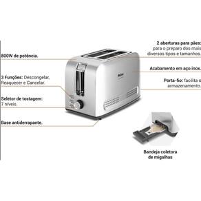 Função Cancelar, Função Re-aquecer, Função Descongelar, 7 níveis de tostagem, Capacidade para 2 torradas, Pés antiderrapantes, Coletor de migalhas, Acabamento em inox, Porta fio.Permite ejeção manual