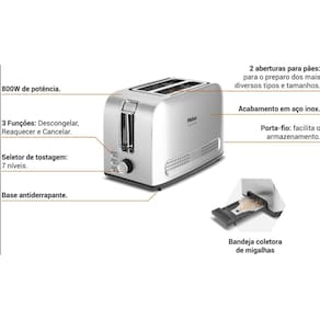 Acabamento em inox. Pés antiderrapantes. Porta fio.Permite ejeção manual