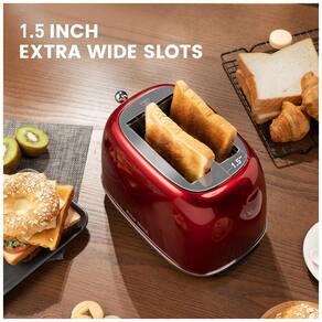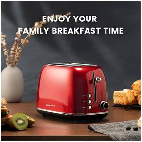 Corpo em aço inoxidável 18/8, design vintage, 2 slots extra largos, 6 níveis de tostagem, 3 funções (cancelar, bagel, descongelar), bandeja coletora de migalhas removível, base estável, sistema antibloqueio, resfriamento rápido, livre de BPA.Permite ejeção manual