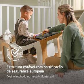 Características: Uso Versátil: Funciona como torre de aprendizagem, cadeira com lousa e banquinho auxiliar. Estilo Montessori: Incentiva a autonomia e participação ativa em atividades domésticas. Altura Ajustável: Adapta-se ao crescimento e diferentes necessidades. Estrutura Leve: Fácil de movimentar entre os cômodos. Acabamento Impermeável: Facilita a limpeza diária. Encaixes Intuitivos: Montagem simples e prática.