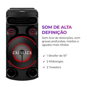 Som, luz, ação! A Torre de Som X Sound 1 AWS-T1W-01B possui 1500W RMS de potência e o som poderoso é garantia de um som de alta definição com graves mais profundos, que vão aquecer qualquer pista! Além disso, as funções Exclusiva Dupla Luz Strobo e o RGB Led Color Lights conferem um cenário de luzes multicoloridas e efeitos luminosos vibrantes que não vão deixar ninguém parado. Saiba mais sobre a Torre de Som X Sound 1 AWS-T1W-01B da Aiwa: