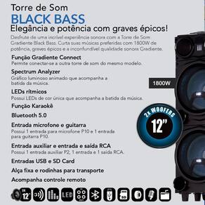 Características: Torre de Som Black Bass - O GDB10M oferece uma experiência completa. É bivolt automático, tem luzes e muita potência para a sua festa. Painel de controle - Acesse todas as funções da GDB10M no mesmo lugar. Possui ainda um display digital que auxilia visualmente a troca de funções. Função Gradiente Connect - Permite conectar duas torres de som GDB10M, criando um efeito estereofônico que aumenta a potência sonora do ambiente e deixa a festa ainda mais animada. 2 Woofers 10 polegadas, 1 tweeter 1,5 polegadas e 1 mid range 3 polegadas - Tem muita potência para curtir o melhor som com 1200 W RMS ! Spectrum Analyzer ? Gráfico luminoso animado que acompanha a batida da música. LEDs rítmicos - Possui LEDs de cor única que acompanham a batida da música. Fácil transporte - Alça fixa e rodinhas nos pés para você levar para qualquer lugar. Controle remoto - Controle todas as funções da sua torre a distância.