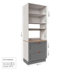 A Torre para Microondas Arizona possui design contemporâneo inspirado no estilo americano. Possui fita de borda em PVC, conferindo alta durabilidade e proteção contra umidade ao móvel. Tampo e rodabanca em BP com portas e frentes de gaveta feitas em MDF que possuem acabamento em Finish Foil e dobradiças com amortecimento, possibilitando fechamento “soft closing”. Suas corrediças são telescópicas, possibilitando abertura total da gaveta. Possui rodapé removível em PVC que pode ser instalado facilmente nos pés do produto. A Torre possui nichos que possibilitam a versatilidade do móvel tornando-o mais espaçoso, conferindo praticidade e usabilidade no dia a dia. Acabamento da Gaveta: Finish Foil Acabamento da Porta: Finish Foil Acabamento da Prateleira: Pintura UV Acabamento dos Pés: Plástico Acompanha Tampo: Sim Altura dos Pés: 140 Ambiente Principal: Cozinha Balcão Acompanha Pia: Não Complexidade da Montagem: Média: pode ser montado por mais de uma pessoa e/ou necessite de maior conhecimento para montagem Cor: Branco/Cinza Claro Cor do Pés: Branco Cor do Produto: Branco/Cinza Claro Escala de Brilho: Acetinado Escala de Brilho da Porta: Semi-Brilho Escala de Brilho da Prateleira: Semi-Brilho Gaveta com Chave: Não Informações Complementares: Portas com dobradiças com amortecimento e gavetas com corrediça telescópica Itens Inclusos: 1 Torre de Microondas, kit de ferragens e instrução de montagem Linha ou Coleção: Arizona Manual de Montagem e Instalação: https://product-hub-prd.madeiramadeira.com.br/818758/documents/79140138-6db4-48ce-9c31-f13dc6f4430010daARZ16BMANUALDEMONTAGEM.pdf Material da Dobradiça/Corrediça da Porta: Metálica Material da Gaveta: MDF/MDP Material da Porta: MDF Material da Prateleira: MDP Material do Puxador da Gaveta: Plástico Material do Puxador da Porta: Plástico Material do Tampo: MDP Material dos Pés: PVC Medida do Tampo (L x C x E): 80 x 52 x 2,5cm Necessita Montagem: Sim Origem do Produto: Nacional Pés Reguláveis: Sim Peso: 75.3 Peso Máximo por Gaveta: 10 Peso Máximo por Prateleira: 5 Possui Pés: Rodapé Possui Portas: 02 Possui Prateleiras: 02 Possui recorte para Cooktop: Não Possui Rodízio: Não Recomendações de Uso, Manutenção e Limpeza: Retire o pó com flanela seca. Sapatas Niveladoras: Sim Sistema de Montagem: Parafusos, Cavilhas e Minifix Suporta Granito: Não Tipo de Corrediça da Gaveta: Telescópica Tipo de Dobradiça/Corrediça da Porta: Soft close Tipo de Puxador da Gaveta: Externo Ean: 7909903208748