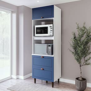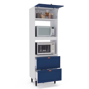 A Torre Quente / Paneleiro possui portas em MDF usinado em baixo relevo para deixar sua casa com muito estilo. Possui puxadores na cor cobre em formato de concha para as gavetas e corrediças telescópicas garantindo uma melhor abertura suportando até 10Kg. Sua porta basculante possui dobradiças e pistão para uma abertura ampla, além de puxador pontual trazendo leveza e elegância. Com 219,4 cm de altura, 70,2 cm de largura e 52 cm de profundidade é possível armazenar todos seus itens essenciais. Seus nichos suportam 25kg garantindo segurança e praticidade no seu dia a dia. Acabamento da Gaveta: Pintura UV Acabamento da Porta: Pintura UV Acabamento da Prateleira: Pintura UV Acabamento dos Pés: Poliéster Altura dos Pés: 17 cm Ambiente Principal: Cozinha Complexidade da Montagem: Média: pode ser montado por mais de uma pessoa e/ou necessite de maior conhecimento para montagem Cor: Branco/Azul Cor do Produto: Branco/Azul Cor dos Pés: Imbuia Cor Flex: Não Cor Interna: Branco Escala de Brilho: Fosco Escala de Brilho da Gaveta: Brilhante Escala de Brilho da Porta: Fosco Escala de Brilho da Prateleira: Fosco Gaveta com Chave: Não Informações Complementares: Até 10 kg sobre as prateleiras dos armários / Até 25 kg sobre a base e a prateleira do nicho Itens Inclusos: 1 móvel desmontado, kit de ferragens, termo de garantia e manual de montagem. Manual de Montagem e Instalação: https://product-hub-prd.madeiramadeira.com.br/934890/documents/1e6ca319-9919-4d92-8b74-1ff9ac9584452253521493317246767423977.pdf Material da Dobradiça/Corrediça da Porta: Metálica Material da Gaveta: MDF Material da Porta: MDF Material da Prateleira: MDP Material do Puxador da Gaveta: Plástico Material do Puxador da Porta: Plástico Material dos Pés: Plástico Montagem Flex: Não Necessita Montagem: Sim Origem do Produto: Nacional Pés Reguláveis: Sim Peso: 53,09 kg Peso Máximo por Gaveta: 10 kg Peso Máximo por Prateleira: 25 kg Possui Espelho: Não Possui Possui Pés: 05 Possui Portas: 01 Possui Prateleiras: 01 Possui Rodízio: Não Recomendações de Uso, Manutenção e Limpeza: Utilize um pano macio umedecido com água e sabão neutro, seguido de pano seco. Não utilize produtos químicos ou abrasivos para limpeza, pois estes danificam o revestimento do móvel. Sapatas Niveladoras: Sim Sistema de Montagem: Cavilha, parafuso, minifix e prego Tipo de Corrediça da Gaveta: Telescópica Tipo de Dobradiça/Corrediça da Porta: 35 mm Tipo de Puxador da Gaveta: Externo Tipo de Puxador da Porta: Externo