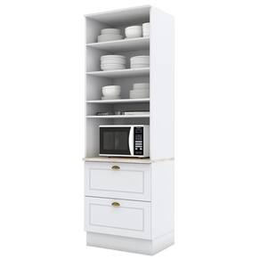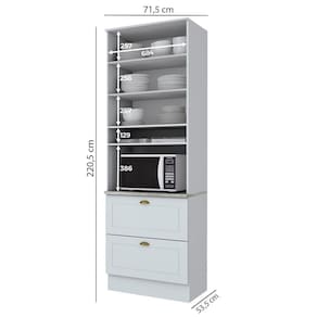 Torre Quente Para Forno 2 Portas e 2 Gavetas 72 cm, cozinha com inspiração no estilo provençal e nas clássicas cozinhas . Estrutura MDF de 15mm (fundo em MDF de 3mm), possui rodapés com opção de instalação suspensa (ferragens para fixação na parede inclusas). Suas 2 portas contam com dobradiças metálicas de 35mm com amortecimento e 2 gavetas com corrediças telescópicas, que proporcionam um deslizar suave e silencioso. Possui 3 prateleiras, cada uma suportando até 8kg. Os fundos da parte dos eletros não devem ser instalados, garantindo maior ventilação. Conta com 1 nicho para mantimentos e acessórios. A pintura UV texturizada proporciona acabamento sofisticado e fácil de limpar. Com tampo de 71,5 x 53,3 cm e espaço para 1 eletrodoméstico. Produto entregue em 3 volumes.
