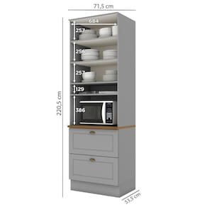 Torre Quente Para Forno 2 Portas e 2 Gavetas 72 cm, cozinha com inspiração no estilo provençal e nas clássicas cozinhas . Estrutura 100% MDF de 15mm (fundo em MDF de 3mm), possui rodapés com opção de instalação suspensa (ferragens para fixação na parede inclusas). Suas 2 portas contam com dobradiças metálicas de 35mm com amortecimento e 2 gavetas com corrediças telescópicas, que proporcionam um deslizar suave e silencioso. Possui 3 prateleiras, cada uma suportando até 8kg. Os fundos da parte dos eletros não devem ser instalados, garantindo maior ventilação. Conta com 1 nicho para mantimentos e acessórios. A pintura UV texturizada proporciona acabamento sofisticado e fácil de limpar. Com tampo de 71,5 x 53,3 cm e espaço para 1 eletrodoméstico. Produto entregue em 3 volumes.