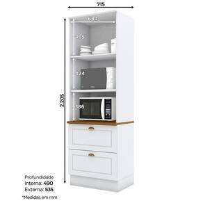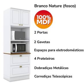 Modelo: C351Materiais: 100% MDF de 15mm (fundo em MDF de 3mm), puxadores, dobradiças, corrediçasAmbiente: CozinhaEstilo: ModernoPeso suportado das gavetas: 3kgPeso suportado das prateleiras: 8kgAltura sem rodapé: 206 cmEspaços para eletros:1 nicho: A: 42,4 x L: 68,4 x P: 48 cm2 nicho: A: 38,6 x L: 68,4 x P: 53,3 cm