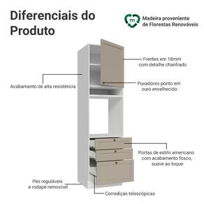 O acabamento de alta resistência da estrutura é em branco e das frentes no tom crema. Possui uma textura suave ao toque, trazendo leveza. O destaque vai para os puxadores ponto em ouro envelhecido, outro diferencial está no detalhe das frentes, refletindo o estilo americano com um toque moderno.