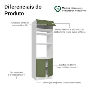 O acabamento de alta resistência da estrutura é em Branco e das frentes em Verde, refletindo o estilo americano com um toque moderno. Possui uma textura suave ao toque, trazendo leveza e sofisticação ao ambiente. O destaque vai para os puxadores ponto em ouro envelhecido, feitos com metal resistente, que adicionam personalidade e um charme único.